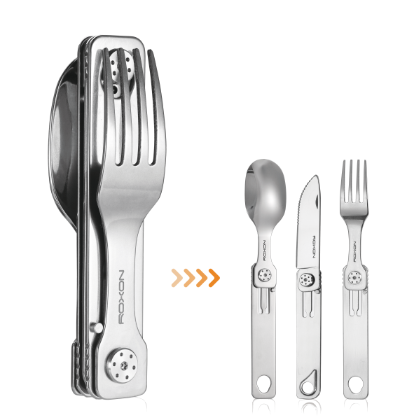 Das faltbare Besteck der Profi-Marke Roxon besteht aus hochwertigem 3Cr13 Edelstahl und bietet Ihnen höchsten Komfort, wenn Sie auswärts Essen. Löffel und Gabel besitzen abgerundete Kanten und sind damit besonders angenehm beim Essen. Das Messer besitzt eine teilgezahnte Klinge, die beispielsweise das Schneiden von Fleisch besonders komfortabel macht.